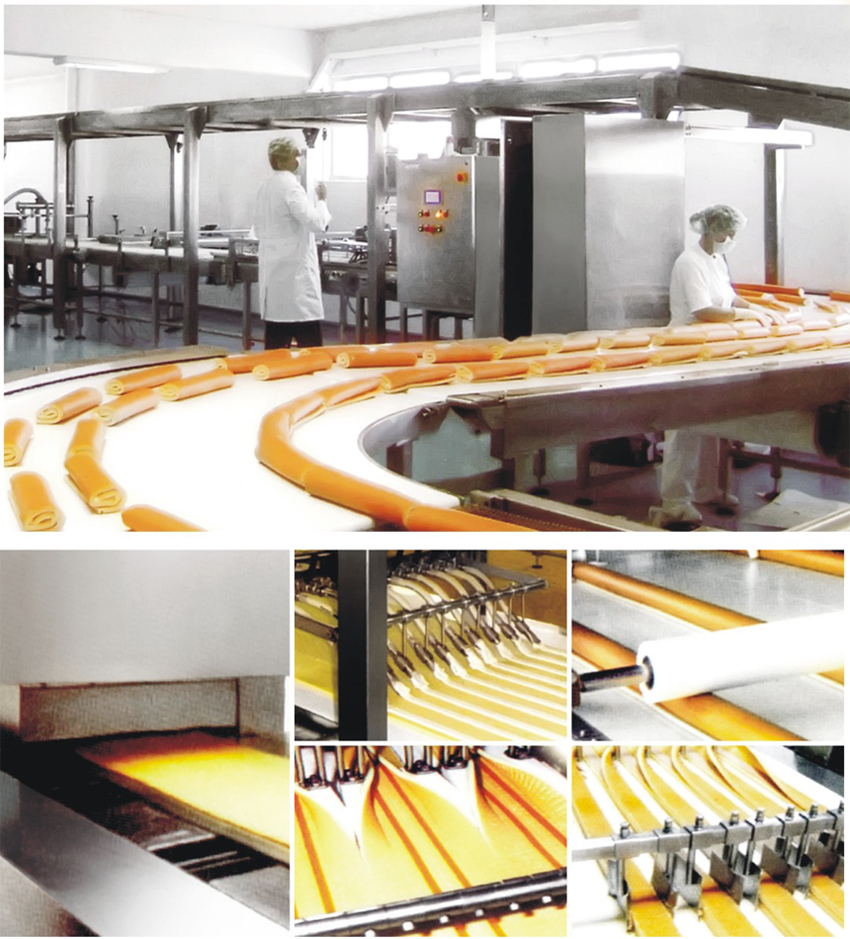 主要功能及用途 該設備是我公司開發的新一代蛋糕生產流水線,從攪拌成形、擠料、烘烤、擠餡、卷圓、切割、冷卻殺菌、包裝。該機全部采用變頻、光、電、氣全電腦控制,使操作省事、省力,食品既衛生保質期又長,可選擇不同類型的隧道爐(如電力、燃油、燃氣、導熱油)。